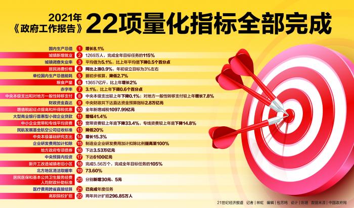 2021年《政府工作报告》22项量化指标全部完成:发展、减负、重研发、促民生并行