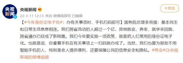 国务院总理李克强:基本民生和日常生活息息相连。我们跨省流动的人超过一个亿,异地就业、养老、就学来回跑,跨省通办已经成了新刚需。我们今年要实施一项政策,就是把人们常用的身份证电子化。也就是说,你拿着手机在有关事项上一扫码就办成了。当然,我们也要为那些不用智能手机的人,特别是老人提供便利,还要保障公民的信息安全和隐私。