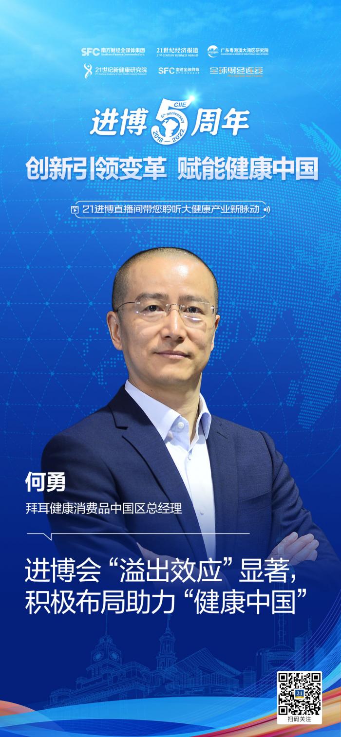 拜耳健康消费品中国区总经理何勇在与21新健康对话时表示,“从早年经过进博会把跨境产品引入中国,到如今我们已经开始将中国研发的产品慢慢推广到国外。五年来,我们有很多收获。”
