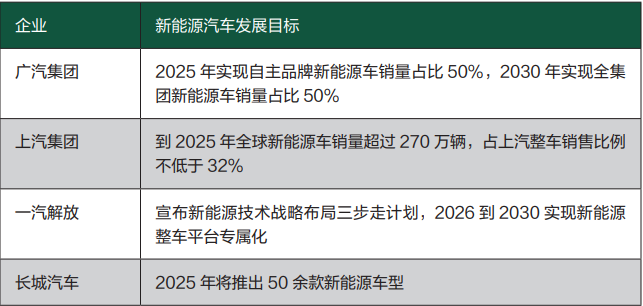 传统燃油汽车企业在发展新能源汽车方面也有不小的进步。比如广汽集团,2021 年,旗下仅广汽埃安就实现新能源汽车产销超 12 万辆,步入国内新能源汽车第一阵营。几家传统燃油汽车企业宣布了自己的新能源汽车发展目标,如图表6所示。