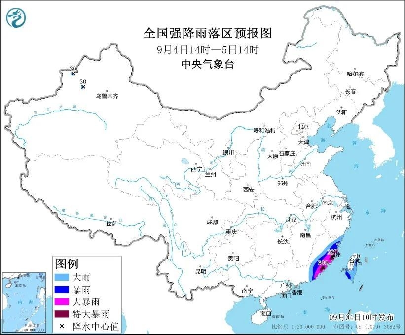 预计,9月4日14时至5日14时,福建东部、广东东部、浙江南部、台湾岛南部和东部等地部分地区有大到暴雨,其中,福建东南部、广东东南部等地部分地区有大暴雨,局地特大暴雨(250~300毫米)。上述部分地区伴有短时强降水(最大小时降雨量30~60毫米,局地可超过80毫米),局地有雷暴大风等强对流天气。