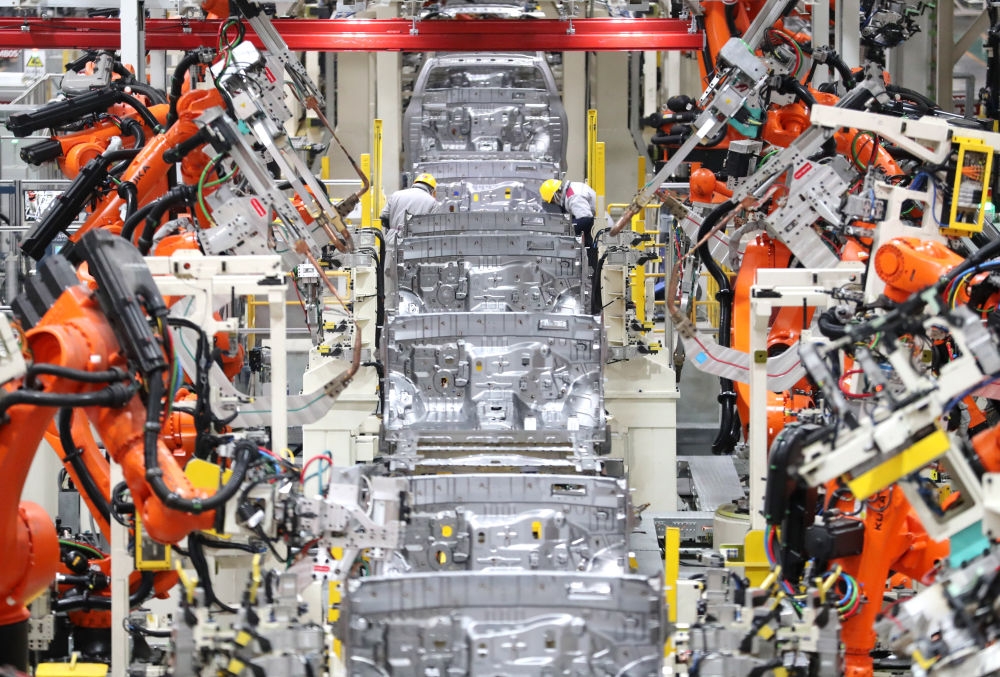 2023年1月14日,在北京汽车制造厂青岛总部基地的生产车间,机器人在焊接作业。新华社发(张进刚 摄)