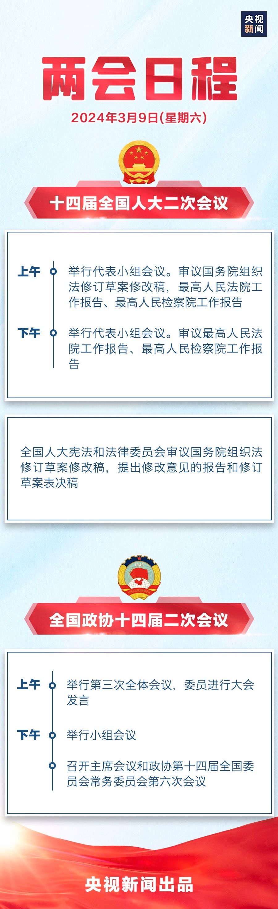 十四届全国人大二次会议9日全天举行代表小组会议。上午,审议国务院组织法修订草案修改稿,最高人民法院工作报告、最高人民检察院工作报告;下午,审议最高人民法院工作报告、最高人民检察院工作报告。