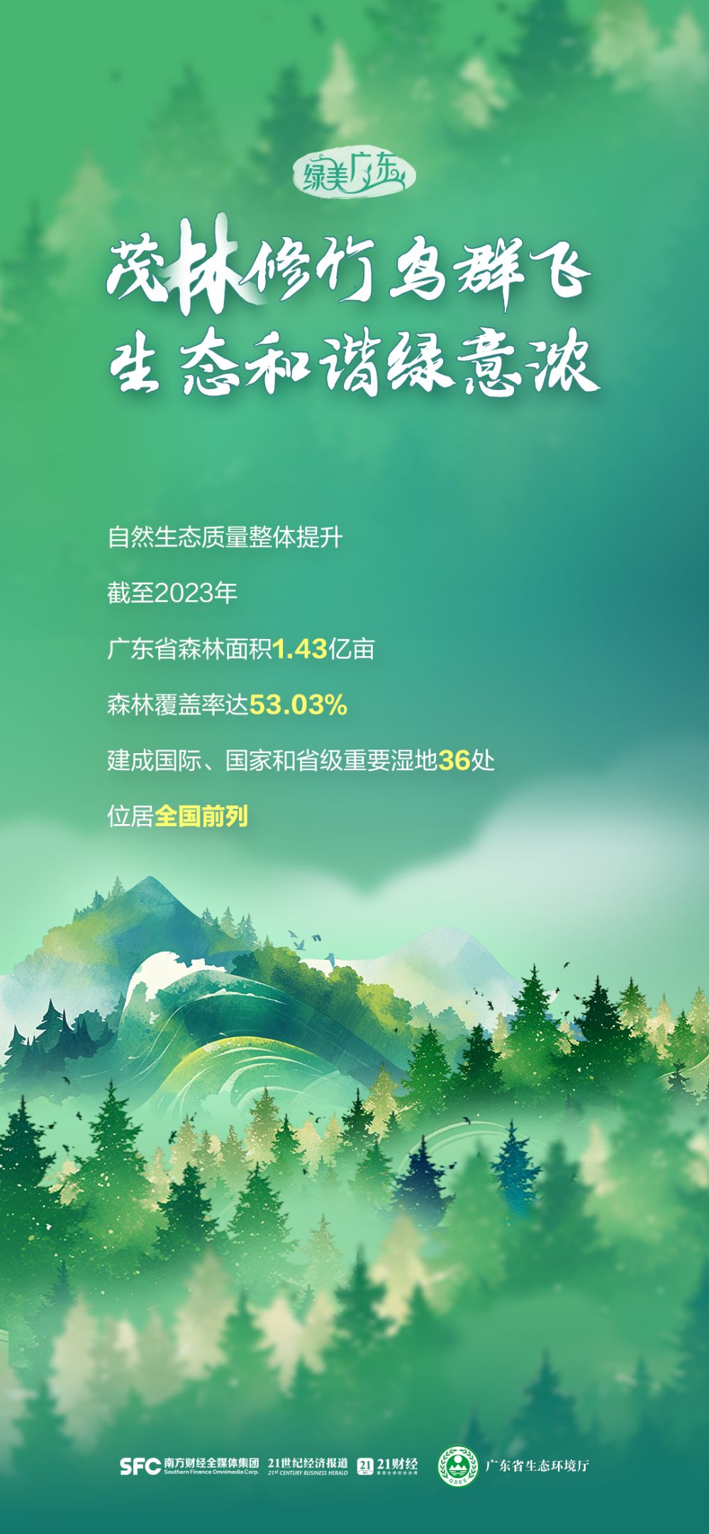 截至2023年,广东省森林面积1.43亿亩,森林覆盖率达53.03%