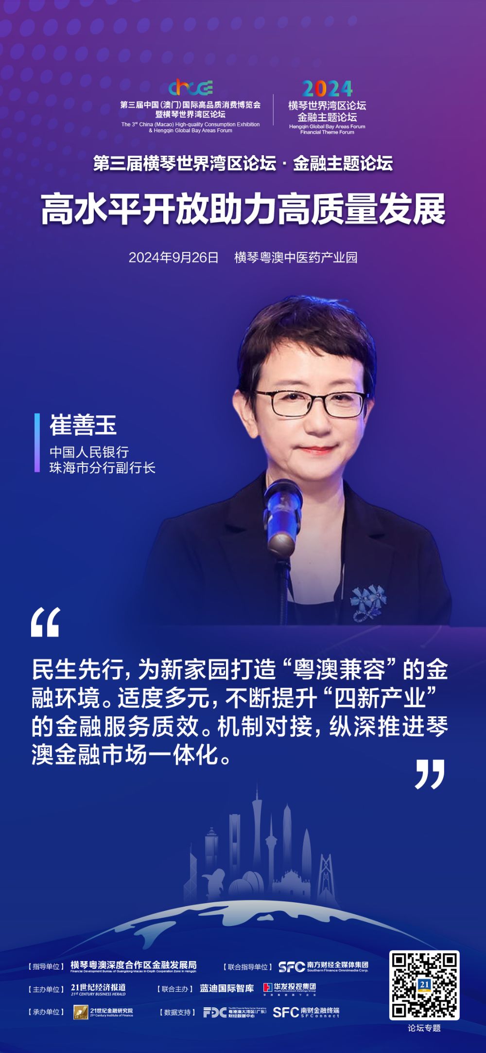 中国人民银行珠海市分行副行长崔善玉在参加金融主题论坛致辞表示,横琴粤澳深度合作区一头连接澳门的国际资源,一头联通内地的广阔市场,承载着助力澳门经济适度多元的重要使命,是粤港澳大湾区扩大对外开放的重要平台。合作区成立三年来,人民银行珠海市分行充分发挥横琴的平台优势,紧密围绕“横琴金融30条”的政策部署,以金融高水平开放助推合作区高质量发展。