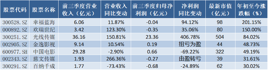 幸福蓝海是2025年影视股中股价反弹最为强劲的公司,年初至今涨幅达201.15%。其前三季度营收为6.06亿元,同比增长11.87%,虽然仍净亏损0.04亿元,但亏损幅度已收窄。
