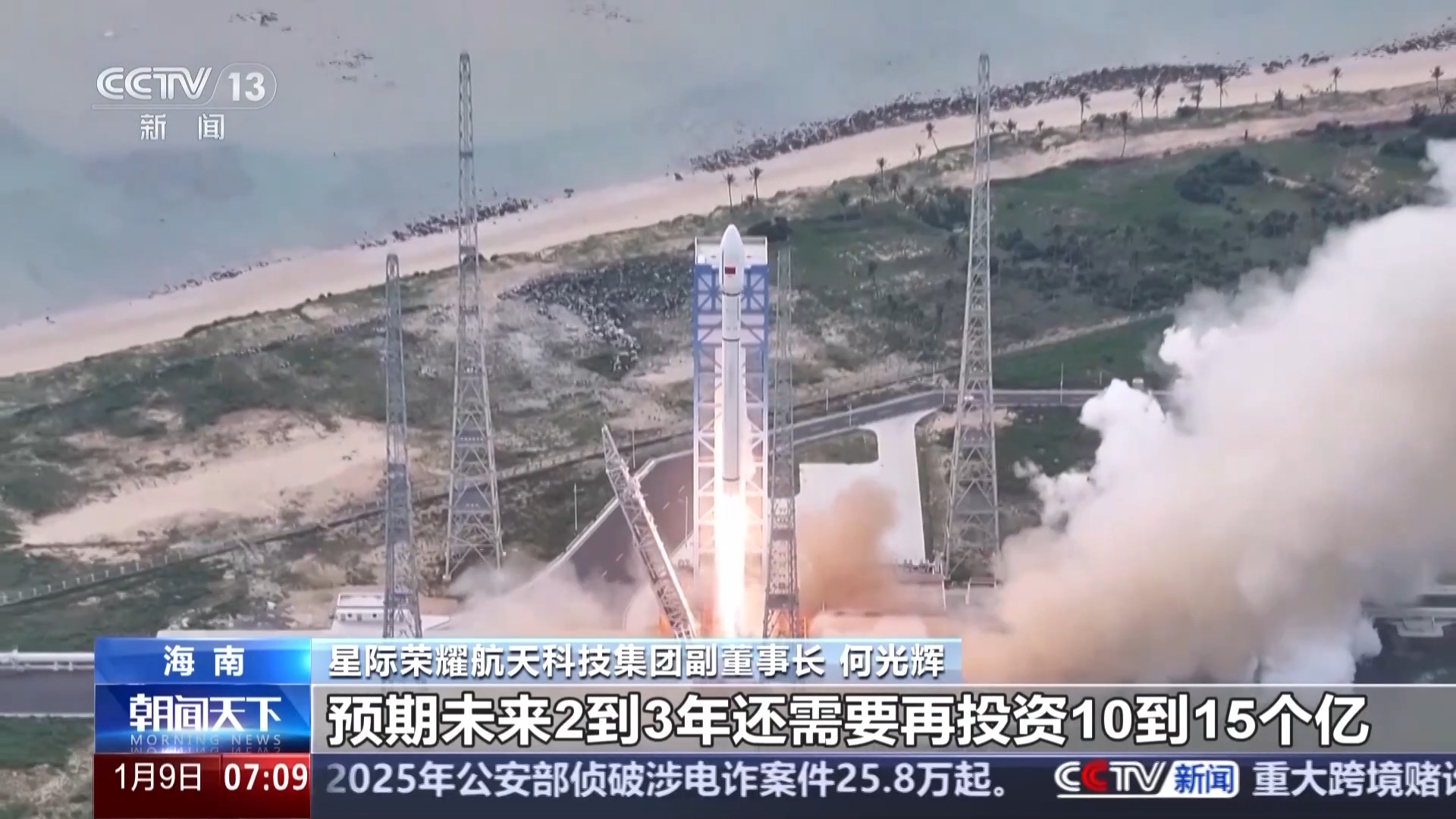 星际荣耀航天科技集团副董事长 何光辉:国家把海南文昌作为商业航天发射基地。自贸港应该说是如虎添翼,预期未来2到3年还需要再投资10到15个亿。