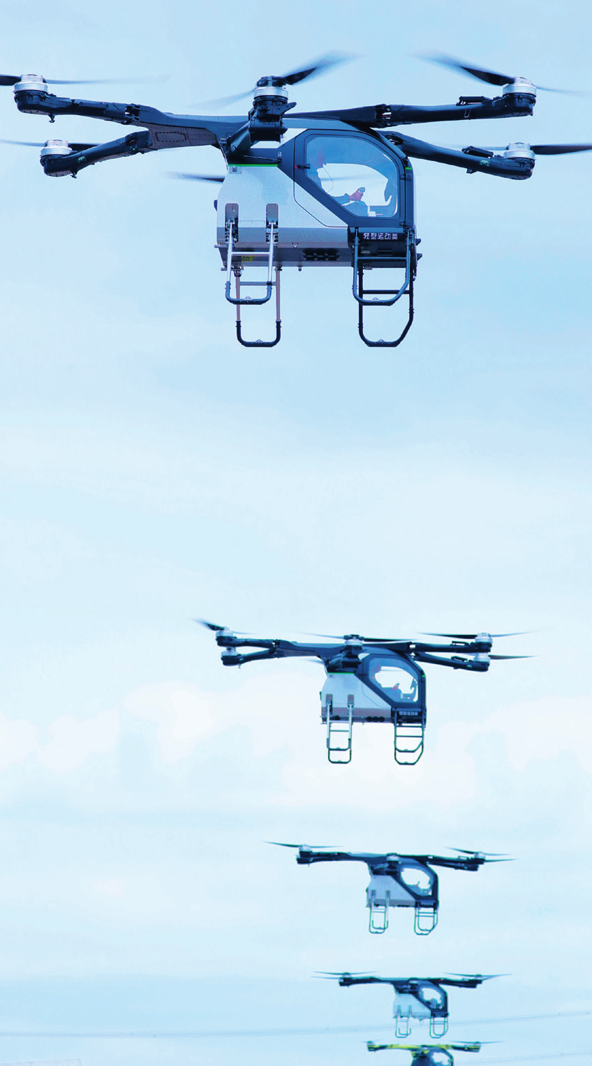 低空经济业态不断延伸。汽车后备舱打开,一辆折叠的载人飞行器徐徐移出,桨叶打开、旋转,能载两人的飞行器在陆地上垂直起飞……去年11月,小鹏汇天试产下线了首台“陆地航母”分体式飞行汽车,通过汽车母舱与飞行器协同,解决个人飞行器在存储、运输、补能等方面的痛点,降低个人飞行门槛。“市民出行‘一键切换陆空模式’,有望成为未来业态的一个发展方向。”赵德力说。