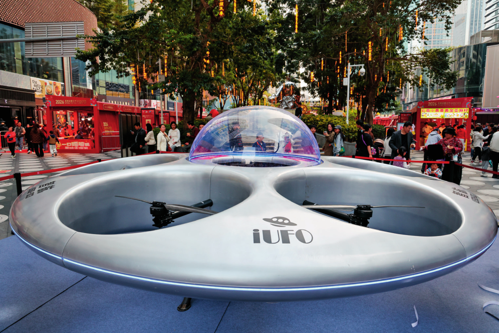 人们在深圳市福田区的节日广场花市观看飞碟形状的载人电动垂直起降飞行器(2026 年 2 月 10 日摄)梁旭摄 / 本刊